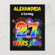 The front of this exciting and lively birthday party invitation postcard design features a personalized name, a vibrant bursting celebratory fireworks inspired pattern, and the message "27 YEARS OLD!" having a colorful rainbow spectrum inspired gradient pattern. The back features a personalized message that could include details about the birthday party, such as when it is happening and where it is being held. Invitation postcards like this might be sent to potential attendees of a birthday party being held in celebration of somebody’s twenty seventh birthday. [~Z0000452]