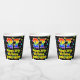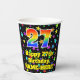 This joyful and fun birthday themed paper cup design features a large number “27” having a rainbow spectrum gradient inspired pattern. It also features the message “Happy 27th Birthday,”, and a custom name. The background features a multicolored star field inspired pattern. Vibrant, colorful paper cups like this might be fun to use at a birthday celebration being held to honor somebody’s 27th birthday. [~Z0000540]