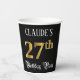 This opulent and fancy birthday-themed paper cup design features an editable name and the message “27th Birthday Party”. The large number “27th” has an imitation/faux gold-inspired coloring pattern, the words “Birthday Party” are in elegant script-style text, and the background is colored black by default (although it can be customized). Luxurious, elegant paper cups like this might be used at a birthday celebration being held to honor somebody’s 27th birthday. [~Z0000567]