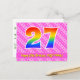 The front of this happy, upbeat, and fun birthday postcard design features a large number "27" having a rainbow spectrum gradient inspired pattern. It also features the message "Happy 27th Birthday,", and an editable recipient name. The front additionally has a cheerful light pink and dark pink striped pattern featuring heart shapes. The back features a customized birthday greeting message, or could perhaps be cleared and left blank if a message is to be written by hand instead. A customizable birthday postcard like this might be a fun way to celebrate somebody’s twenty seventh birthday. Postcards like this might also be used to invite guests to a birthday celebration being held for somebody who is turning 27 years old. [~Z0000449]