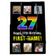 This bold and fun birthday-themed gift bag design features a large number “27“ having a colorful rainbow spectrum inspired gradient pattern, along with the message “Happy 27th Birthday,“ and a personalized recipient name. Above and below the message are some photos that can be personalized, perhaps with photos of the recipient, the recipient’s family and friends, and/or the sender(s) of the gift. A birthday themed giftbag like this might be a fun way to wrap a present being given to somebody who is celebrating their twenty-seventh birthday. (Photography © Storytree Studios, Stanford, CA.) [~Z0000669]