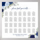 This exquisite 28-table wedding seating chart features a rustic hand-painted watercolor floral design that exudes elegance and charm, with delightful roses in shades of dusty blue, navy, and indigo, this seating chart is a true work of art. Sprinkled throughout the design are enchanting sprigs of eucalyptus leaves and lush garden greenery, while the elegant script calligraphy title adds a touch of refined sophistication. With seating arrangements for 280 guests, and 10 seats per table, this seating chart is both practical and visually appealing, making it effortless for your guests to find their seats. Transform your wedding reception into an enchanting wonderland with this stunning seating chart that captures the essence of rustic romance and timeless style.