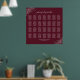 This beautiful wedding seating chart features a simple yet elegant design with pale gray text on a burgundy or maroon background. The title is written in script calligraphy lettering and reads: please find your table. The chart is decorated with a frilly floral faux foil silver filigree in the corners. Contains seating assignments for 28 tables at 10 guests per table or 280 guests.