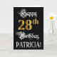 The front of this elegant and luxurious birthday-themed greeting card design features the message “Happy 28th Birthday,”, along with a personalized recipient name. Part of the message is in a formal script-style text. The large number “28th” features a faux/imitation gold-inspired look pattern. The background is colored black. The inside has a personalized birthday greeting message, or could perhaps be cleared and left blank if a message is to be written by hand instead. An elaborate, personalized birthday greeting card like this might be a respectable way to deliver a birthday greeting message to somebody who is celebrating their twenty-eighth birthday. [~Z0000559]