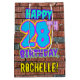 The front of this fun birthday themed gift bag design features the message “HAPPY 28TH BIRTHDAY,” having a colorful, vibrant, urban street art and graffiti inspired appearance, in addition to a customizable recipient name. The background features a brick wall inspired pattern. A vibrant gift bag like this might be used when giving a gift or present in honor of somebody’s 28th birthday. [~Z0000536]
