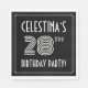 This 1920s/1930s style inspired twenty-eighth birthday celebration paper napkin design features a custom name, a fancy art deco style inspired number “28th”, the message “BIRTHDAY PARTY!”, and a border pattern consisting of lines. It has a black-colored background by default, but it can be customized to a different color, if desired. Paper napkins like these might be used at a party held in celebration of somebody’s twenty eighth birthday. [~Z0000616]
