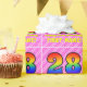 This happy and fun 28th birthday themed wrapping paper design features a large number "28" having a colorful pattern inspired by the appearance of a rainbow spectrum. It also features the message "Happy 28th Birthday,", followed by an editable name. The background features a light pink and dark pink stripes pattern containing loving pink heart shapes. Fun wrapping paper like this might be used when wrapping presents being given to somebody in celebration of their twenty eighth birthday. [~Z0000415]