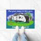 This doormat can be customized to show your name on top. When used outside of your travel trailer, people will know who they are talking to when they see you. Non-slip rubber that won't crack or buckle, this mat resists fading, mold, and mildew and can be easily cleaned with a hose. This version has a trailer similar to a Grand Design Reflection 297rsts trailer. It can be used indoors or out and makes a great welcome mat for your campsite, wherever you may go. To customize the name, click on the text "put your name in this area" and change it to whatever you want. If you don't see the text change on the actual design, you haven't done it quite right. You might have to double-click on some devices to be able to change it. Happy camping!