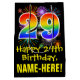 This fun, colorful, and exciting birthday-themed gift bag design features a large number "29" with a rainbow spectrum gradient style pattern, along with the message "Happy 29th Birthday,", and a customizable recipient name. It also features a colorful background pattern inspired by the look of bursting celebratory fireworks. A birthday themed gift-bag like this might be a fun way to wrap a gift or present being given to somebody who is celebrating their 29th birthday. [~Z0000509]