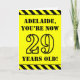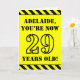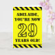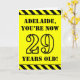 The front of this bold and fun birthday themed greeting card design features a custom name and the message "YOU’RE NOW 29 YEARS OLD!" in black stencil look text on a yellow colored background. The front also features an eye-catching black and yellow stripes pattern at the top and bottom edges. The inside features a customized birthday greeting message, or could perhaps be cleared and left blank if a message is to be written by hand instead. A birthday card like this might be a fun way to send birthday wishes to somebody who is celebrating their twenty ninth birthday. [~Z0000413]