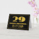 The front of this Roaring Twenties inspired and vintage look birthday themed greeting card design features a large art deco appearance inspired number "29", the message "HAPPY BIRTHDAY,", an editable name, and a border pattern consisting of lines. The front also has a black-colored background. The inside features a customizable birthday greeting message, or could perhaps be cleared and left blank if a message is to be written by hand instead. A customizable birthday card like this might be a fun way to send a message in celebration of somebody’s twenty ninth birthday. [~Z0000506]