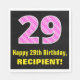 This joyful and fun birthday-themed paper napkin design features a large number "29" having a stripes pattern containing heart shapes colored dark pink and light pink. It also features the birthday greeting message "Happy 29th Birthday,", and a personalized name. Paper napkins like this might be fun to use at somebody’s twenty ninth birthday party. It might also be a fun choice for somebody whose birthday falls on Valentine's Day (February 14), due to its loving heart symbols and colors. [~Z0000436]