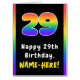 This bold and exciting birthday-themed greeting card design features the number “29“ with a multicolored rainbow spectrum inspired gradient pattern, along with the message “Happy 29th Birthday,”, and a custom recipient name. The inside has a custom birthday greeting message, or could perhaps be cleared and left blank if a message is to be written by hand instead. A fun, editable birthday greeting card like this might be given in celebration of somebody’s twenty-ninth birthday. [~Z0000628]