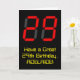 The front of this silly and fun birthday themed greeting card design features a large number "29" having a red seven segment digital display style appearance, along with the message "Have a Great 29th Birthday," and a personalized name, on a black colored background. The inside features a custom birthday greeting message, or could perhaps be cleared and left blank if a message is to be written by hand instead. A personalized birthday card like this might be a fun way to acknowledge somebody’s twenty ninth birthday. [~Z0000386]