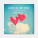 Save the date magnet. 2 bright red heart shaped balloons floating upwards into the blue sky with some white fluffy clouds.