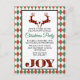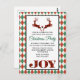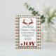 A Christmas party invitation postcard with an illustration of 2 Christmas deer jumping. Deer are made of red and black lumberjack plaid, with a little heart in between them. Joy written at the bottom. The background is a red and green argyle pattern.