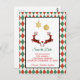 Save the date Christmas postcard with an illustration of 2 Christmas deer jumping. Deer are made of red and black lumberjack plaid, with a little heart in between them. Faux gold glitter Christmas decorations hang down from the top. The background is a red and green argyle pattern.