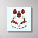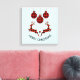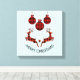 Canvas print which says "Merry Christmas" in curved text. Designed with an illustration of 2 Christmas deer jumping. Deer are made of red and black lumberjack plaid, with a little heart in between them. Red and black plaid Christmas decorations hang down from the top. Light blue background.