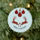 Christmas ornament which says "Merry Christmas" in curved text. Designed with an illustration of 2 Christmas deer jumping. Deer are made of red and black lumberjack plaid, with a little heart in between them. Red and black plaid Christmas decorations hang down from the top.