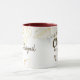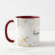 Inspirational quote scripture personalized coffee mug depicts a simple gold leaf abstract design. It features Bible Verse 2 Corinthians 5:17, "If anyone is in Christ, the new creation has come: the old has gone, the new is here!" Customized with a name or details of your choice._