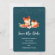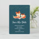 Save the date card with a drawing of 2 red foxes. One standing up the other laying down. Drawn with watercolor.