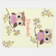 One of owl has light chocolate brown head, pink body which has light blue and yellow pattern and dark chocolate brown wings. The other has light brown head, pink body and dark chocolate brown wings. The leaves are filled with several colors on hazy brown branches. The text is in salmon pink and is customizable. This is a digital illustration.