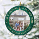 Celebrate the joy of your new place with a custom two photo "First Christmas in our New Home" green and gold round ceramic ornament. All text and pictures on this template are simple to personalize, and can be different or the same on front and back. (IMAGE & TEXT DESIGN TIPS: 1) To adjust position of wording, add spaces at beginning or end. 2) To center the photo exactly how you want, crop it into a square shape before uploading to the Zazzle website.) Design features an elegant green brushed stainless steel border, modern minimalist typography family name & year, and 2 images of your choice. Please note that gold id printed color, not foil. This unique family keepsake adds a stylish touch to Xmas home decorations or makes a thoughtful housewarming realtor gift idea. There's no place like a new home for the holidays!