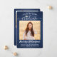Share the joy of a high school or college graduation with these custom 2 photo navy blue, white and silver announcements. (IMAGE PLACEMENT TIP: An easy way to center a picture exactly how you want is to crop it before uploading to the Zazzle website.) This template includes graduate name, class year & school, and is simple to customize with any wording of your choice, such as party invitation details, parents' names, special honors, degree title, favorite inspirational quote, graduate's contact info, future education plans, or new job position. If there's any text not wanted simply delete it. Design features a dark blue brushed background, faux foil mortar board cap, handwritten style script calligraphy, modern minimalist typography, and two photos of your choice, such as senior pictures or images from the commencement ceremony. Please note that background is printed color not metallic foil. These elegant graduation announcement cards are a stylish way to share your special day celebration with family and friends. Congratulations to the graduate!