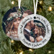 Celebrate a joyful 1st holiday as a married couple with a custom 2 photo "Our First Christmas as Mr. & Mrs." round metal faux marble ornament. All text and images on this template are simple to personalize. (IMAGE & TEXT DESIGN TIPS: 1) To adjust position of wording, add spaces at beginning or end. 2) To center the photo exactly how you want, crop it into a square shape before uploading to the Zazzle website.) Design features a stylish modern black and white faux marble border, handwritten style script calligraphy names, wedding date & year, and two pictures of your choice. This unique wedding keepsake adds an elegant touch to the newlyweds' Xmas home decorations.