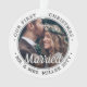 Celebrate a joyful 1st holiday as Mr. & Mrs. with a custom 2 photo "Our First Christmas Married" black and white round acrylic ornament. All text and images on this template are simple to personalize and can be different or the same on front and back. As an idea, the script typography can read "Together" or "Engaged." (IMAGE & TEXT DESIGN TIPS: 1) To adjust position of wording, add spaces at beginning or end. 2) To center the photo exactly how you want, crop it into a square shape before uploading to the Zazzle website.) Design features a stylish black and white border, handwritten style calligraphy, the couple's names & year, and two pictures of your choice. This unique & modern wedding keepsake adds an elegant touch to Xmas home decorations. Makes a cute wedding gift idea for the bride and groom.
