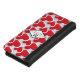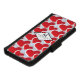 A phone case wallet personalized with a name and initial and designed with a repeating pattern of 2 different sized red hearts each heart surrounded by a white border. A diamond shaped frame layered over top with your text inside.