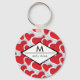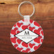 A keychain with a repeating pattern of 2 different sized red hearts each heart surrounded by a white border. A diamond shaped frame layered over top with your name and initial inside.