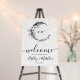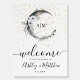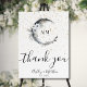 Boho Stars Crescent Moon Celestial Monogram Wedding Sign. This elegant two-sided wedding sign features a watercolor midnight sky crescent moon, gold stars, and white flowers, feathers, and other bohemian accents on both sides. The design has a white background, which you can customize to any color to change the look. The front side serves as a 'welcome to the wedding of' welcome sign with the bride and groom's names and wedding date, while the back side serves as a thank you sign with the same details. The fonts are currently black, but can also be changed. A mix of script calligraphy and a classic serif font. This versatile sign can be used for a ceremony, reception, or rehearsal dinner. With its whimsical boho celestial theme, it adds a touch of romantic elegance to any wedding event, creating a beautiful atmosphere under the stars.