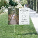 Welcome wedding guests to your ceremony or reception with this elegant custom photo outdoor lawn sign. All text is simple to personalize, and the picture can be different or the same on front and back. (IMAGE PLACEMENT TIP: An easy way to center a photo exactly how you want is to crop it before uploading to the Zazzle website.) Simply place in lawn outside as a yard decoration or to welcome guests to the event. The modern minimalist black and white design features up to two photos of your choice, chic handwritten style script calligraphy, art deco inspired vintage typography, and a customizable message that reads "welcome to our happily ever after." This wedding welcome sign is a stylish way to share engagement pictures while adding a personalized touch to your special day celebration decorations. Congratulations to the bride and groom!