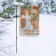 Merrily celebrate the Christmas Season with a religious but non-denominational Saints_Aplenty garden flag featuring an adorable auburn-haired angel delivering an undecorated evergreen tree to a Church! As a light snow falls, her small wings aflutter, the angel pauses as she ascends the Church’s stone steps barefooted to flash the viewer a warm Yuletide smile. This charming antique image is from a late 19th-early 20th-century pre-1907 undivided back postcard, original publisher unknown, printed in Germany in chromolithography, from the designer’s private collection. She’s an angel sure to charm your flag’s viewer(s) with her winsome ways!