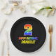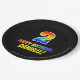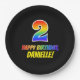 This fun, colorful, and cheerful birthday-themed paper plate design features a large number "2" and the message "HAPPY BIRTHDAY,", both colored with a rainbow spectrum gradient inspired pattern, along with a bold yellow customizable name. It has a black colored background. Fun, editable paper plates like this might be used at a birthday party being held to celebrate somebody’s 2nd birthday. [~Z0000488]