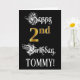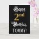 The front of this fancy and formal birthday-themed greeting card design features the message “Happy 2nd Birthday,”, along with an editable recipient name. Part of the message is in a luxurious script-style text, the large number “2nd” features a faux/imitation gold-inspired look pattern, and the background is colored black. The inside has a customizable birthday greeting message, or could perhaps be cleared and left blank if a message is to be written by hand instead. A lavish, customizable birthday greeting card like this might be a respectable way to deliver a birthday greeting message to somebody who is celebrating their second birthday. [~Z0000559]