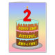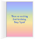 This upbeat and joyful birthday-themed greeting card design features a cartoon-style depiction of a three-tier birthday cake having a numeral-shaped candle on top showing the number “2“, along with the message “HAPPY 2ND BIRTHDAY,”, and a custom recipient name. The background of the front features a multicolored pastel rainbow spectrum inspired gradient pattern. The inside features a custom birthday greeting message, or could perhaps be cleared and left blank if a message is to be written by hand instead. A cheerful, customized birthday greeting card like this might be used to celebrate somebody’s second birthday. [~Z0000626]