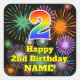 This exciting and joyful birthday-themed square sticker design features a large number “2” with a colorful rainbow spectrum gradient inspired pattern, along with the message “Happy 2nd Birthday,”, and an editable name. The background features a colorful pattern inspired by the appearance of bursting celebratory fireworks. Fun, personalized stickers like this might be given as a birthday present, or used while wrapping presents/gifts, or perhaps used as a birthday party decoration when celebrating somebody’s 2nd birthday. [~Z0000579]