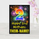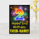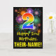 The front of this colorful, exciting, and fun birthday-themed greeting card design features a large number "2" having a rainbow spectrum gradient inspired pattern. It also features the message "Happy 2nd Birthday,", and a personalized recipient name. The front additionally features a colorful background pattern inspired by the look of bursting celebratory fireworks. The inside features a customized birthday greeting message, or could perhaps be cleared and left blank if a message is to be written by hand instead. A customizable birthday card like this might be a fun way to send a message in celebration of somebody’s second birthday. [~Z0000442]