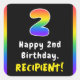 This joyful and cheerful birthday square sticker design features a big number “2“ with a multicolored rainbow spectrum inspired gradient pattern, along with the message “Happy 2nd Birthday,”, and a custom recipient name. Eye-Catching birthday themed stickers like these might be distributed or used at a birthday party for somebody who is celebrating their second birthday, or perhaps used when preparing presents or invitations for such an event. [~Z0000630]