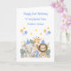 This blue watercolour 2nd birthday card is suitable for twins or a single child. The design includes a birthday number 1, balloons, stars, a giraffe, an elephant wearing a party hat, and a lion wearing a party hat. All text is fully customisable.