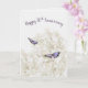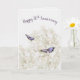 Purple butterflies on white hydrangea blossoms on soft white textured background for 30th anniversary.