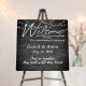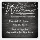 Glowing white light strings with a welcome sign on dark gray rustic wood for 30th anniversary party.