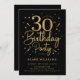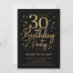30th birthday party invitation in black and gold. Trendy modern design, perfect for a stylish men's or women's bday celebration. Features script font and confetti. Customize with your own details. Printed Zazzle invitations or instant download digital printable template.