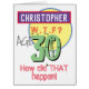 Celebrate a birthday with a personalized card showing name and birthday age. Funny message says "How did THAT happen!". Add your own personal message inside too. 30 years old.