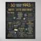 30th Birthday Flashback Poster A digital poster loaded with fun facts, data, and highlights of what happened back in 1993! Gold and white text on a "chalkboard texture" background - flaws are part of the design to make it look unique and realistic. These posters make an excellent conversation piece for your next get-together or party! Add a mat and a frame and you have a beautiful birthday keepsake.