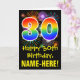 The front of this exciting, fun, and colorful birthday-themed greeting card design features a large number "30" with a rainbow spectrum gradient inspired pattern, along with the message "Happy 30th Birthday,", and a custom recipient name. The front additionally has a colorful background pattern inspired by the appearance of bursting celebratory fireworks. The inside features a customizable birthday greeting message, or could perhaps be cleared and left blank if a message is to be written by hand instead. A personalized birthday card like this might be a fun way to celebrate somebody’s thirtieth birthday. [~Z0000442]