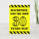 The front of this attention-grabbing and bold birthday themed greeting card design features a personalized name and the message "YOU’RE NOW 30 YEARS OLD!" in black stencil style text on a yellow colored background. There is also an eye-catching black and yellow stripes pattern at the top and bottom edges of the front. The inside features a customizable birthday greeting message, or could perhaps be cleared and left blank if a message is to be written by hand instead. A customizable birthday card like this might be a fun way to send a message in celebration of somebody’s thirtieth birthday. [~Z0000413]