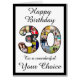 The front of this huge classical themed 30th birthday greeting card design features the number "30" filled in with 12 of your photos. The message "Happy Birthday," sits at the top with the two lower sets of text available for you to personalized. Make this a unique custom card for your best friend, daughter, partner, goalkeeper etc, the choice is yours. The inside features a personalized birthday greeting messages on both pages, or could perhaps be cleared and left blank if a message is to be written by hand instead. A customizable photo birthday card like this is a fun way to send a message in celebration of somebody’s twentieth birthday. The photo's used as examples are all square images with the main figure approximately central. The design is available in a full range of sizes right up to the giant size card. Pop in to our store for more great birthday cards and gift ideas.